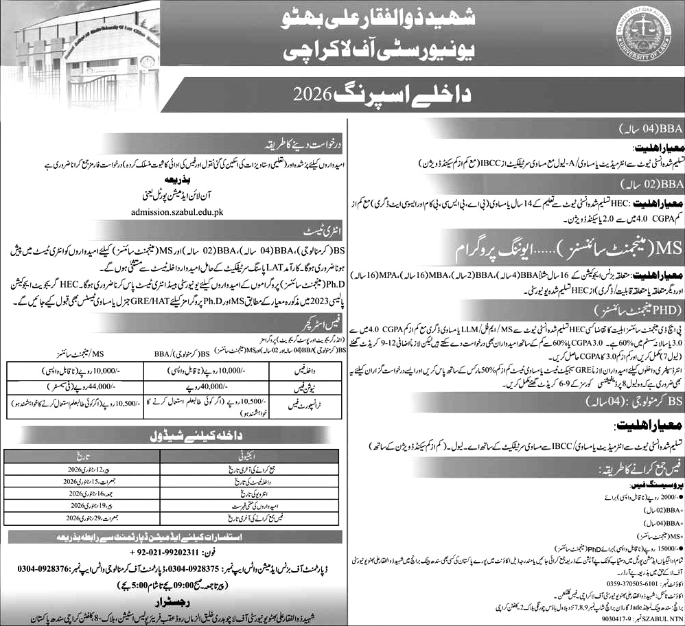 Details: https://szabul.edu.pk/admissionannounce.html