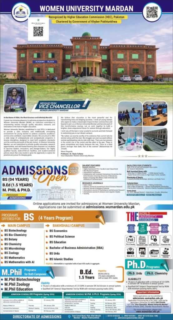 Women University, MardanMain Campus | Bakhshali CampusAdmissions Spring 2026